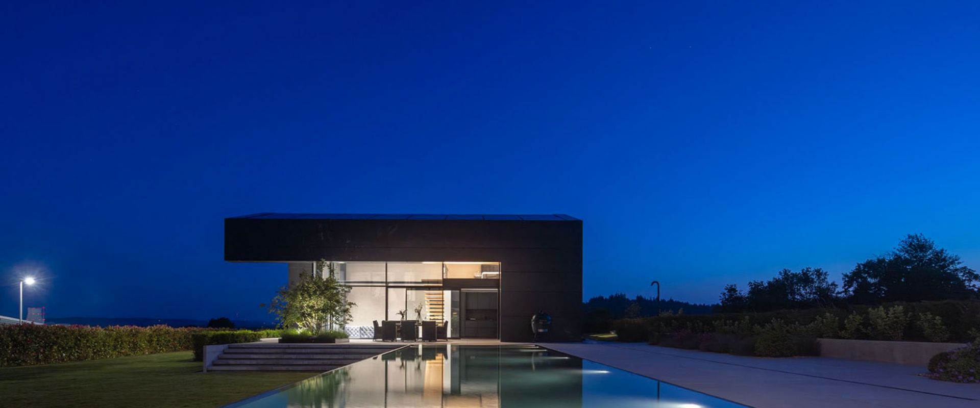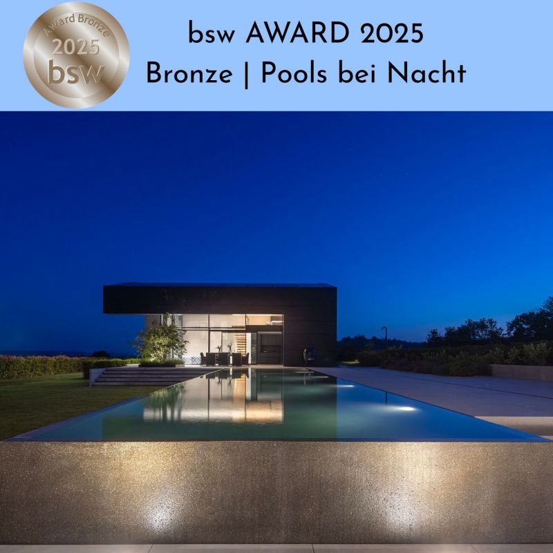 "Ein sehr großzügiges Poolareal! Hier ist nicht nur das Becken mit Wasser "bis zum Rand" gefüllt, sondern wahrscheinlich auch das Herz des Besitzers mit Glück. Clean, offen und transparent ist die Anlage. Aber sie wirkt keineswegs kalt. Haus und Schwimmbecken bilden eine Symbiose, die sich in einem einheitlichen und faszinierenden Lichtdesign widerspiegelt."